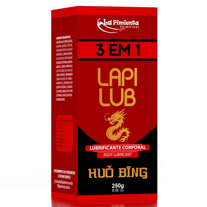 LAPI LUB 3 EM 1 HUO BING: DESFRUTE DE UM MIX DE SENSAÇÕES HOT E ICE QUE TRANSCENDEM A SENSAÇÃO DE PRAZER NA HORA H! O ÚNICO PRODUTO NO MERCADO SENSUAL COM A PROPOSTA MÁXIMA que combina alto poder lubrificante de deslizamento fantástico, efeito térmico duplo instigante e aroma beijável marcante para tornar cada momento uma explosão sensorial. Aguçando os sentidos, despertando toques irresistíveis e trazendo inovação para a relação, LAPI LUB 3 EM 1 HUO BING oferece tudo isso em uma fórmula de alta performance.